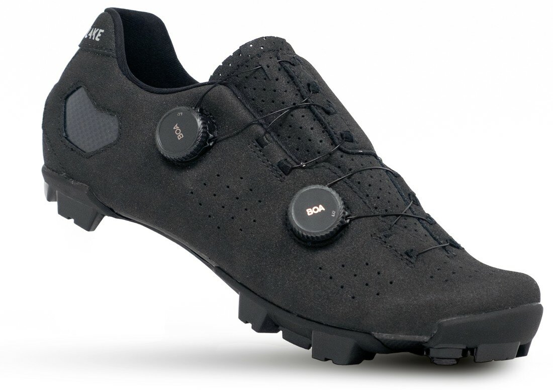 závodní tretry LAKE MX333 s dvěma upínacími systémy BOA, 100% karbonovou podrážkou s tvarovatelným patním dílem a svrškem z broušené kůže Helcor